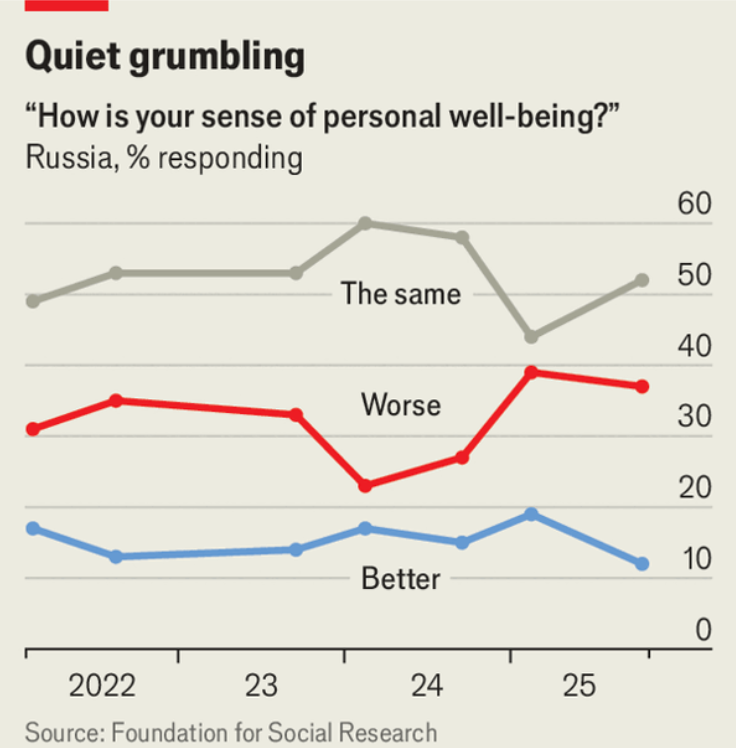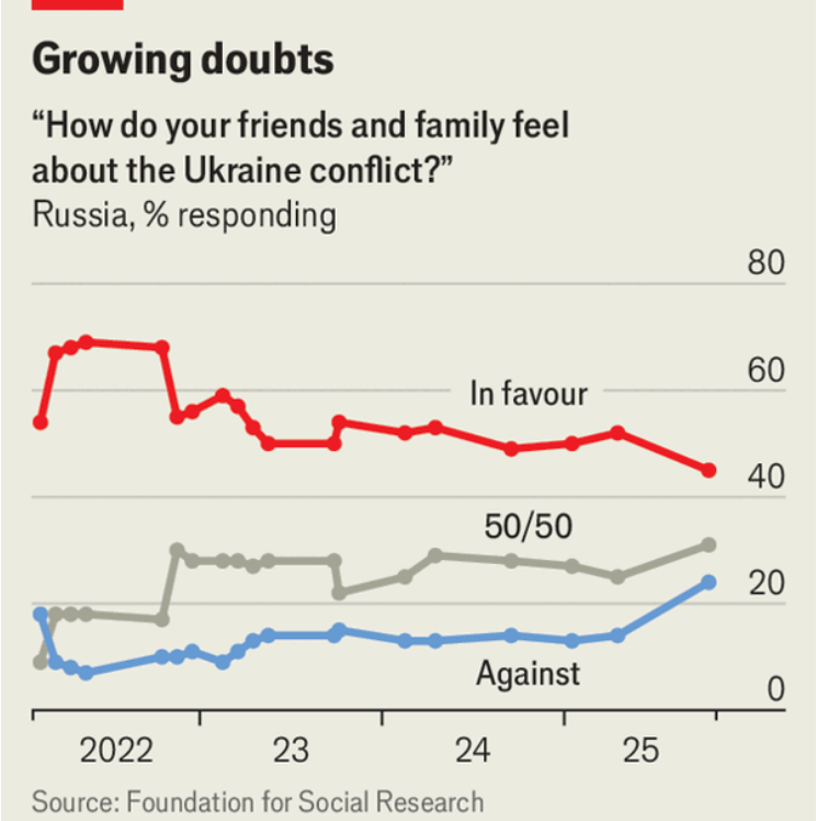 Public sentiment data are deteriorating too: in one survey, those saying well-being was worsening were triple those saying it was improving, the highest since the war began. War zealots never exceeded 25%, and perceived “inner-circle” opinion flipped from 57%–39% pro-war in May 2023 to 55%–45% anti-war or evenly split in October 2025; Levada finds only 40% see veterans as heroes, and an experiment found 88% wish the war to end but only 47% expect Putin to deliver that.