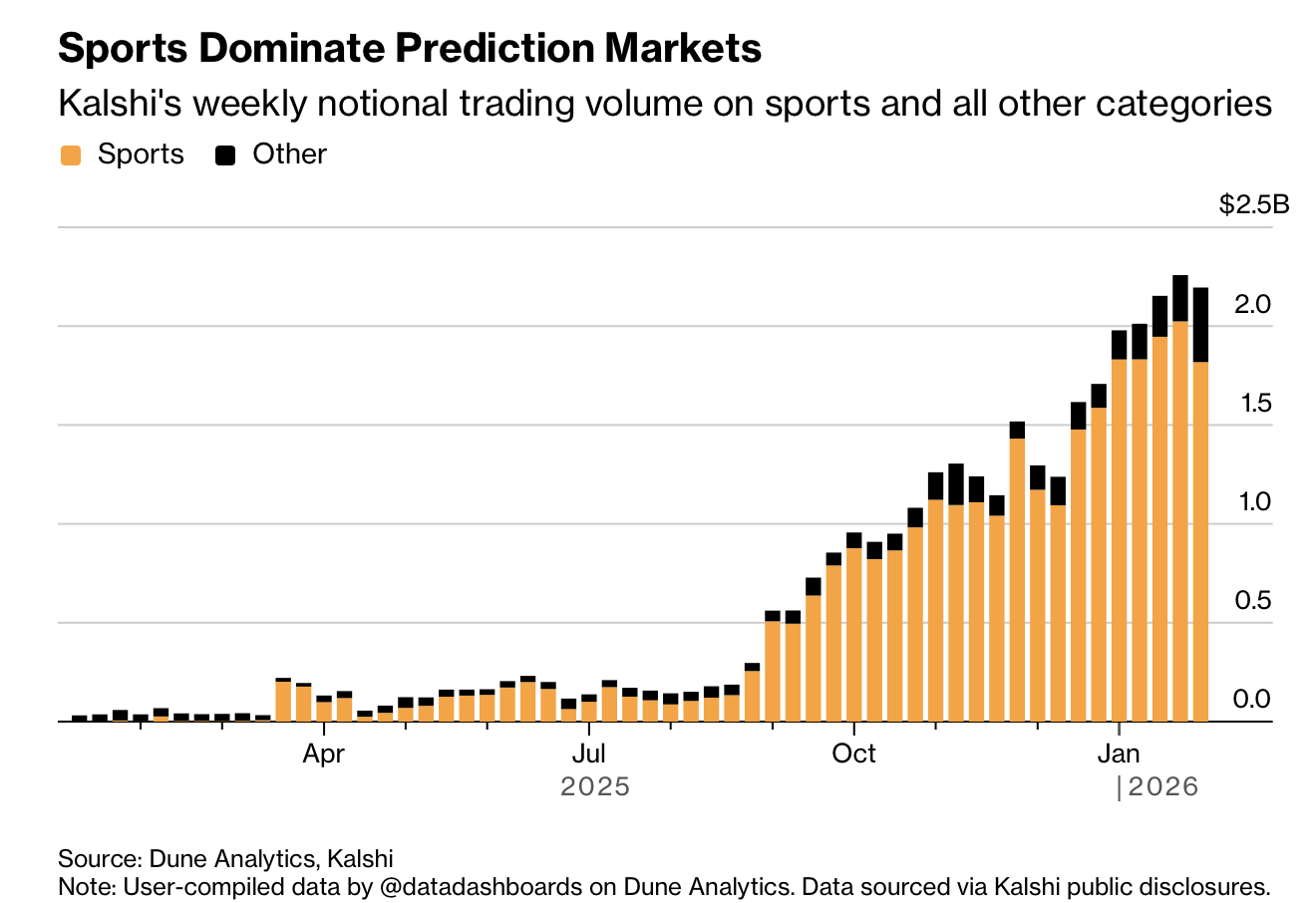 预测市场正在重塑职业博彩的运作方式。2026 年 1 月,Kalshi 的交易量接近 100 亿美元,其中超过 85 亿美元与体育赛事相关;其应用当月下载量达 300 万次,超过任何一家传统博彩应用的四倍。到目前为止,Kalshi 与 Polymarket 上与超级碗相关的合约交易额已超过 8 亿美元,而美国人在受监管博彩平台上对该赛事的投注预计约为 18 亿美元。相比之下,传统体育博彩在 1 月的投注规模去年约为 160 亿美元,显示预测市场正迅速分流资金。