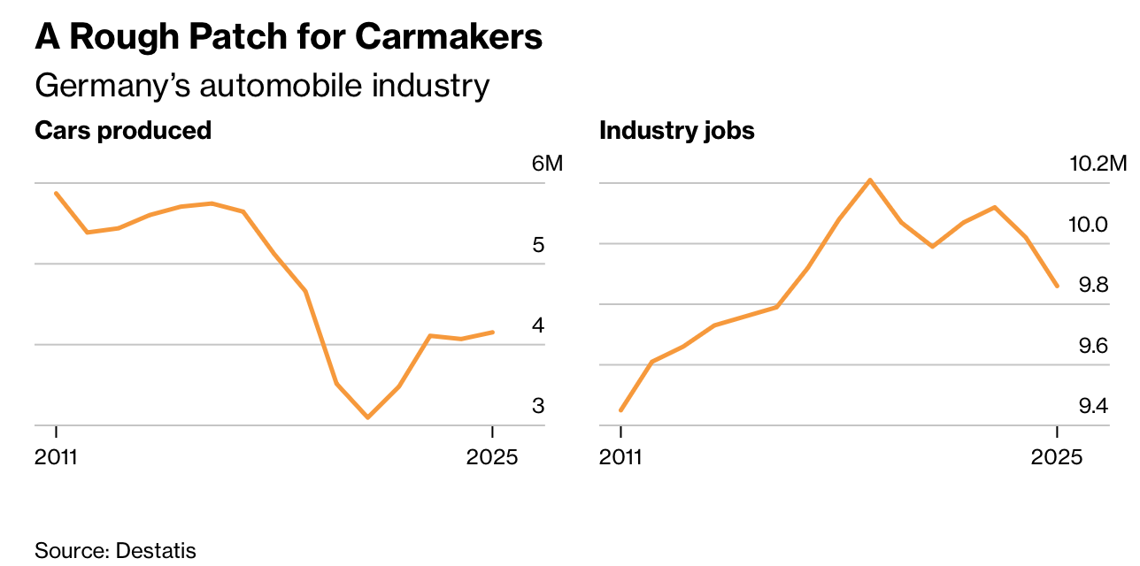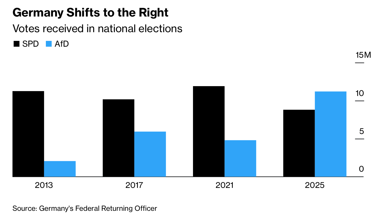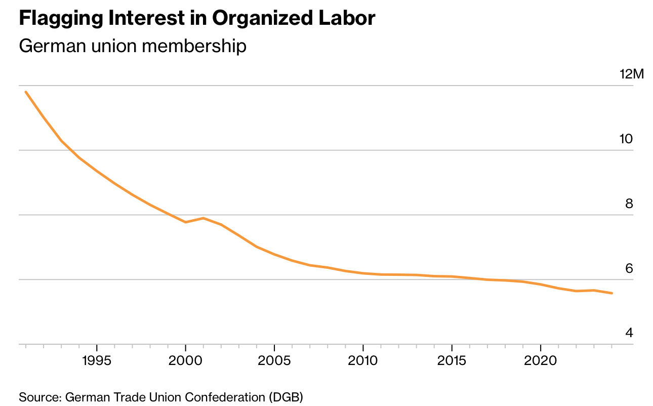 Structural change has weakened the traditional labor bloc. Since German reunification in 1990, union membership has fallen to less than half its former level. Surveys show skilled blue-collar workers backing the far-right Alternative for Germany at rates well above the national average, mirroring working-class shifts in the US and France. At the same time, Germany’s industrial sector is shedding about 10,000 jobs a month. An IW survey found nearly half of trade groups expect further job losses in 2026, signaling erosion of a model once defined by stability.