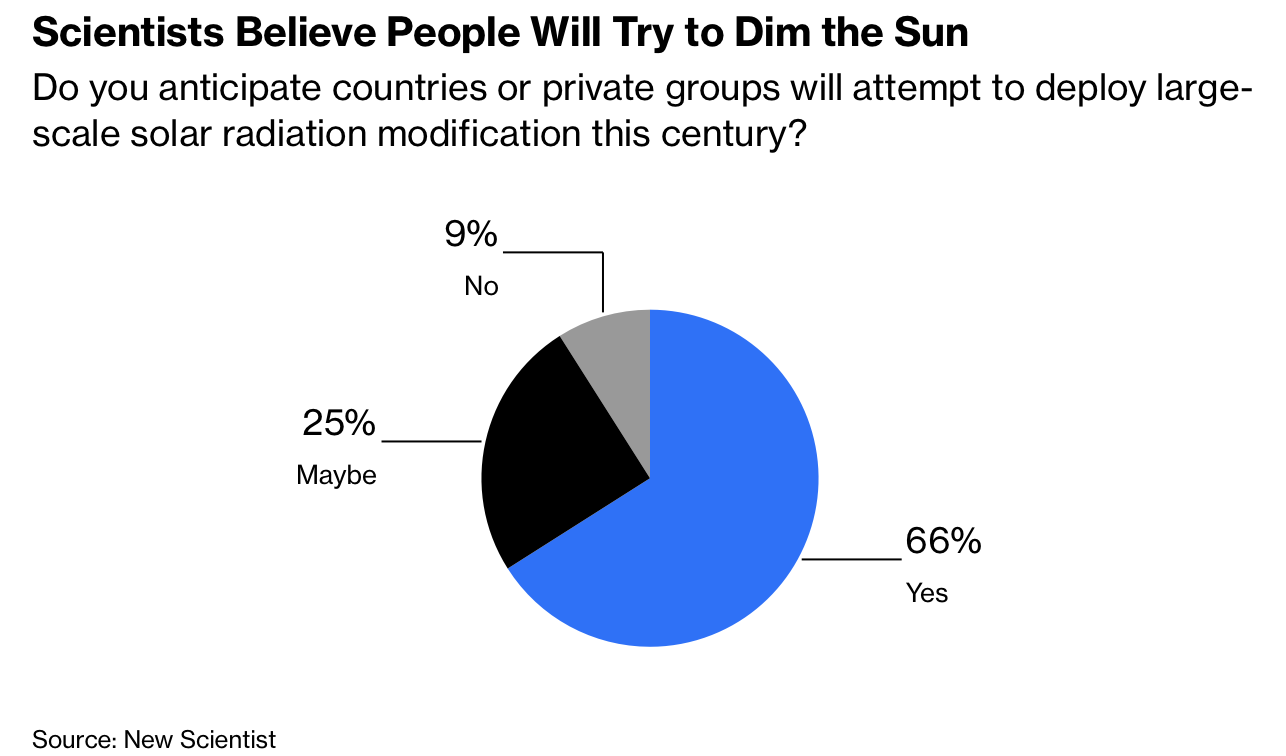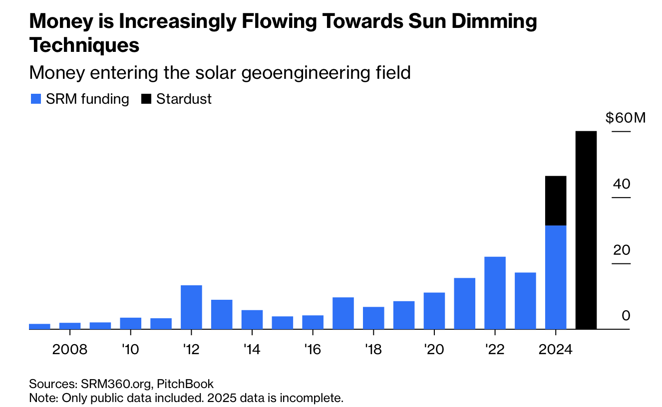 Record private investment is moving solar radiation management (SRM) from the scientific fringe into a commercial industry: between 2007 and 2024 commercial solar geoengineering raised only $17.6 million, yet in 2024 a single US-Israeli startup, Stardust, secured $60 million—over three times that prior total. A recent poll found only 9% of climate researchers believe large-scale SRM will not be attempted by 2100, while over half expect the first deployment to come from a lone “rogue actor” (a corporation, billionaire, or state), reflecting pessimism about emissions cuts. SRM can mask warming but cannot address drought or ocean acidification, and halting it risks “termination shock,” a rapid, decade-scale temperature spike.