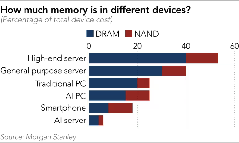 Prioritization of AI customers leaves smaller buyers exposed. Some NAND suppliers have raised prices more than 70% this year yet cannot deliver more units. SSD demand surged in late 2025, creating an estimated 2026 NAND bit-gap above 10%, versus under 2% for 2025. Analysts expect NAND prices to rise 15–20% in Q4 2025 and increase again by low-to-mid teens in early 2026. AI-driven allocation is crowding out non-AI segments, pushing broader commodity memory prices higher.