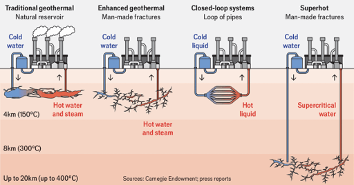 新一代地热采用增强型地热系统(EGS)和闭环系统(CLS),突破传统需要自然裂隙的局限。借助页岩油时代发展出的水力压裂和多分支水平钻井技术,EGS可在无天然裂隙的岩石中创造人工储层,并已实现钻井时间同比缩短70%,大幅降低成本。CLS虽更复杂成本更高,但适用于水资源短缺或禁用压裂的地区,德国项目已将侧钻时间减半,目标发电8兆瓦,供热64兆瓦。