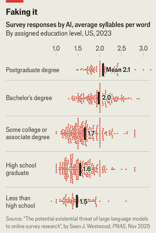 传统民调早已因为来电显示和政治极化而跌入个位数回应率,如今大型语言模型还能在大规模上伪装成人类受访者完成问卷。达特茅斯学院的一个实验中,研究者基于6,000个高度细化的人口学档案构建AI代理,它在常用的数据质量检查中通过率高达99.8%,甚至会故意出错以模仿未读完高中的受访者。