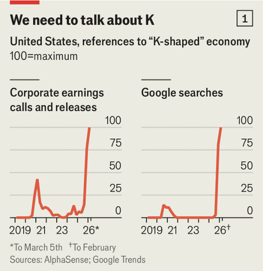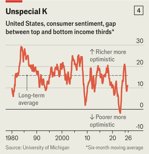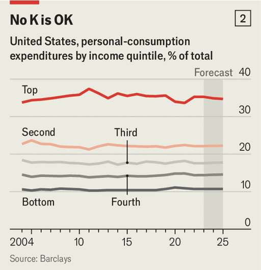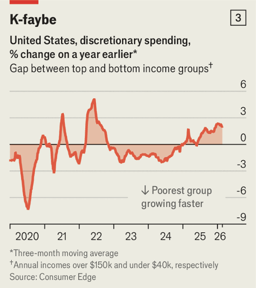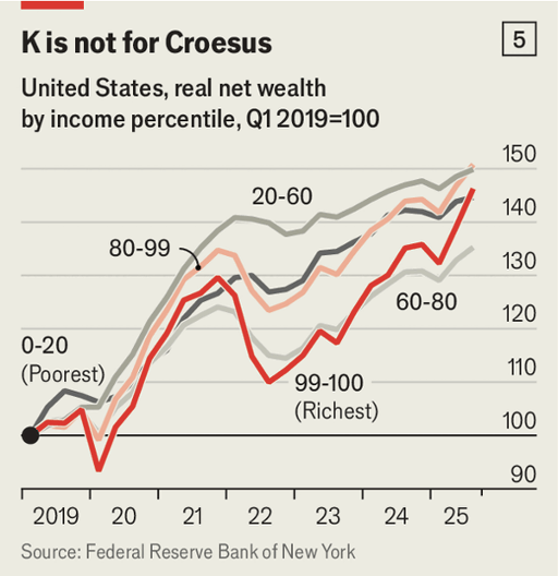 Other indicators likewise fail to show a strong “K-shaped” divergence. Credit- and debit-card data suggest the gap in spending growth between rich households and others has fluctuated but averaged around zero in recent years. Wage growth among lower-income workers has been similar to that of higher earners and was faster in the years immediately after the pandemic. Asset data also show that since the pandemic the net worth of rich households has not consistently outpaced that of poorer ones; wealthy households saw large declines during the 2022 market slump, while lower-income households experienced slower but steadier gains.