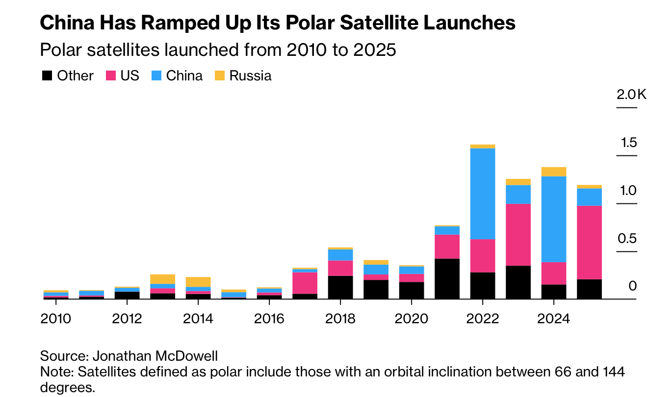 北极地面站需求随中美太空竞争与极地卫星激增而快速扩张。Deadhorse(阿拉斯加)因具备光纤传输能力成为关键节点,RBC Signals已从1座天线扩展到多座,并新增3.9米天线;在高纬度可每日观测同一卫星14次以上,而中纬度仅约4次。气候变化推动“北极航道”开通,中国计划夏季常态化航运并大幅增加极地卫星数量。美国则通过巨额军费加强北极部署:Northrop Grumman获逾41亿美元合同用于2031年前建造两颗极轨卫星,波音则获28亿美元合同并拥有参与120亿美元计划的更多选项。