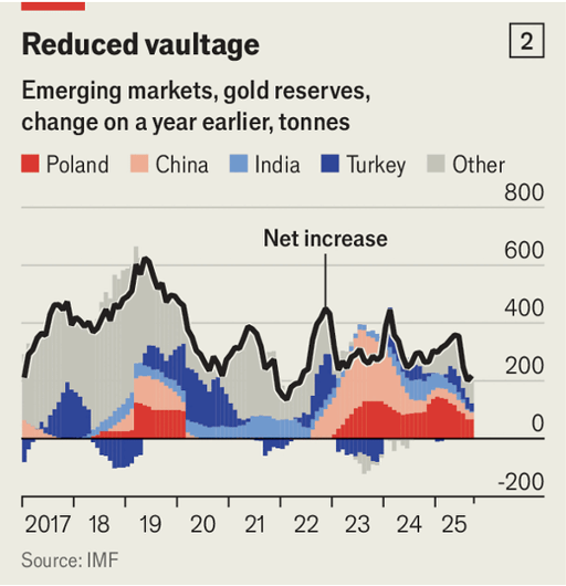 This year, gold’s price has nearly doubled since March 2024 despite no recession, with the S&P 500 up nearly 30% in the same period and real interest rates remaining high. Some attribute the rise to central bank buying amid concerns about dollar debasement, yet data show the dollar's exchange rate has stabilized and 30-year Treasury yields have been mostly flat. Emerging market central banks’ gold purchases have increased but remain small in absolute terms and are concentrated in a few banks, with IMF data indicating a slowdown in official buying since last year.