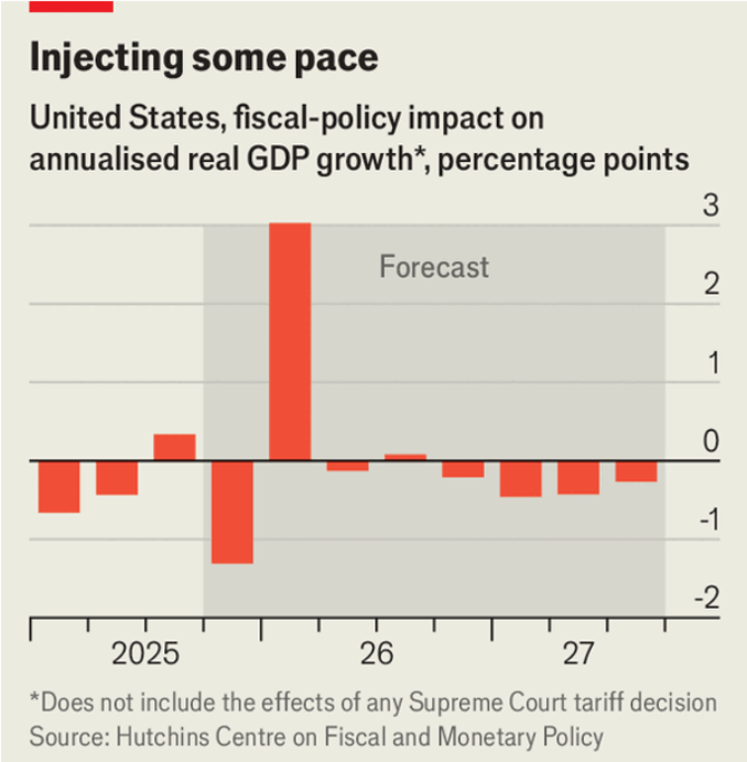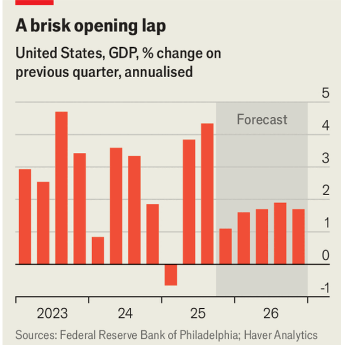 US growth in 2026 could accelerate as the BBB tax-cut law enacted in July delivers “two years of tax cuts in one” worth about $191bn via retroactive 2025 refunds and lower monthly withholding. Piper Sandler estimates this alone adds about 0.3% to GDP after roughly 1.9% growth in 2025, versus a Philadelphia Fed survey consensus of 1.8% growth for 2026.