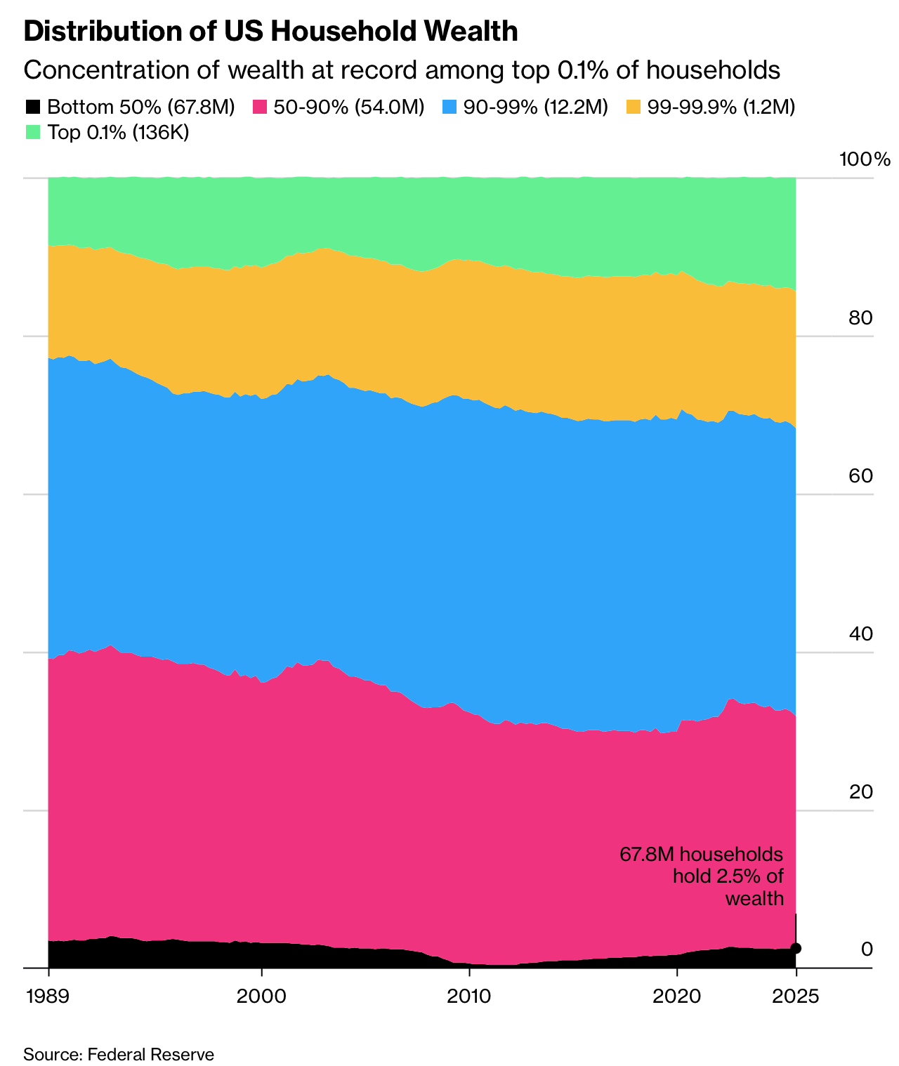 The gains are especially concentrated at the very top. The richest 0.1% increased their wealth by about 40% over three years, double the roughly 20% gain of the bottom 90%. Federal Reserve records since 1989 show both the top 1% and top 0.1% at all-time highs in wealth share; longer-run academic estimates suggest a comparable concentration last occurred in the mid-1940s. Globally, the Bloomberg Billionaires Index shows that the world’s 500 richest people added more than $2 trillion in 2025, with their total wealth doubling to nearly $12 trillion since the start of the decade.