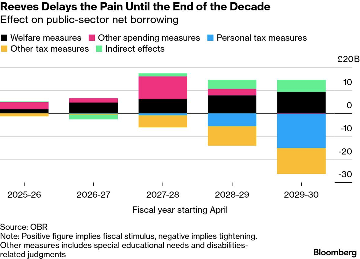 The structural issue lies in the timing of the tax changes. Reeves’ £26 billion in tax increases are heavily backloaded, with charts showing spending remaining elevated for the next few years before fiscal drag intensifies ahead of the next election. This delay shifts adjustment costs into the later decade, amplifying economic and political strain once tightening arrives. The fiscal path thus adopts an early-loose, late-tight profile, with substantive reform effects concentrated after 2028.