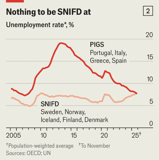 The reversal has accelerated. Australia’s jobless rate, historically 0.5 percentage points above New Zealand’s, is now 1 point lower as New Zealand absorbs a housing-bubble bust. Costa Rica has cut unemployment from persistent double digits to 5.8%. Canada’s rate has climbed in recent months even as America’s has stayed steady. The biggest shift is in southern Europe: after averaging nearly 20% unemployment in 2012–13, Portugal, Italy, Greece and Spain now collectively post lower joblessness than the Nordics; Greece is at 8.2%, while Finland’s recently exceeded 10% for the first time since the 1990s.