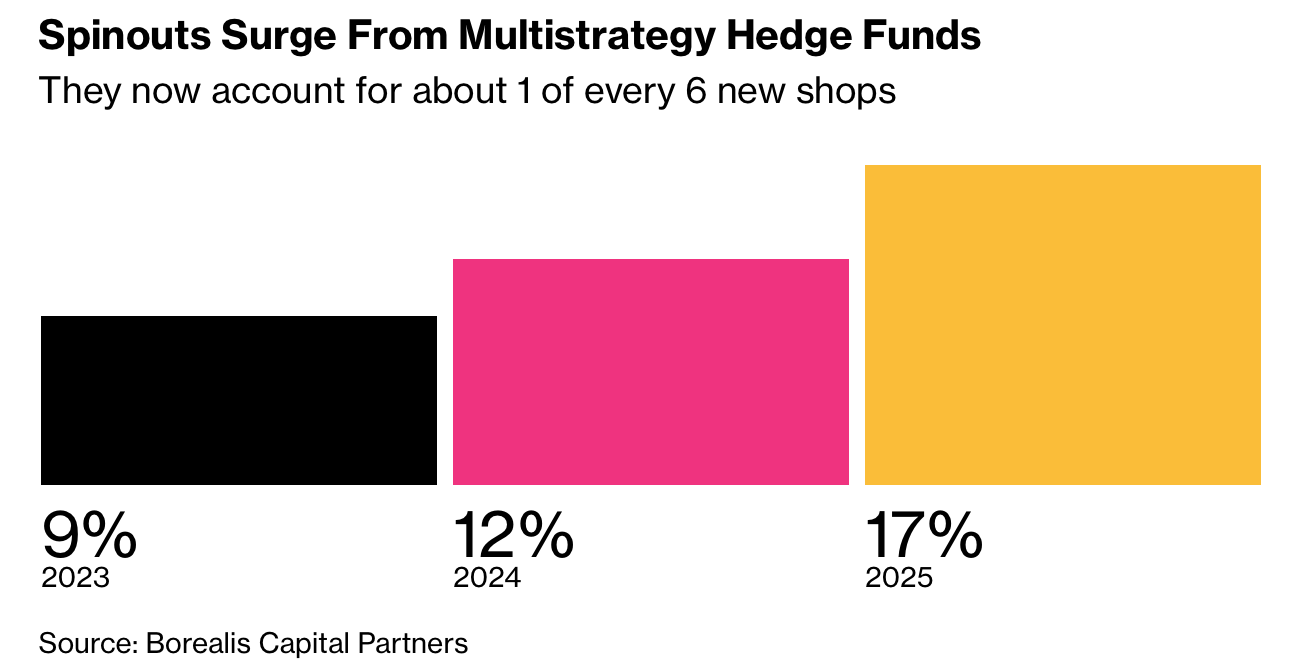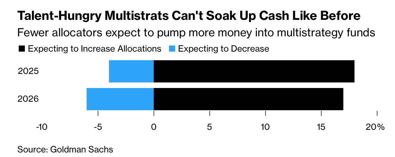 对冲基金行业出现结构性迁移:来自多策略平台的离职者占新基金创立的17%,较两年前几乎翻倍;行业经历16年来最佳收益与自2007年以来最大资金流入后,更多交易员选择独立。大型平台(合计管理超2300亿美元)因规模与人才约束放缓扩张,部分甚至停止募资并累计向投资者返还320亿美元利润,资金配置意愿也下降。