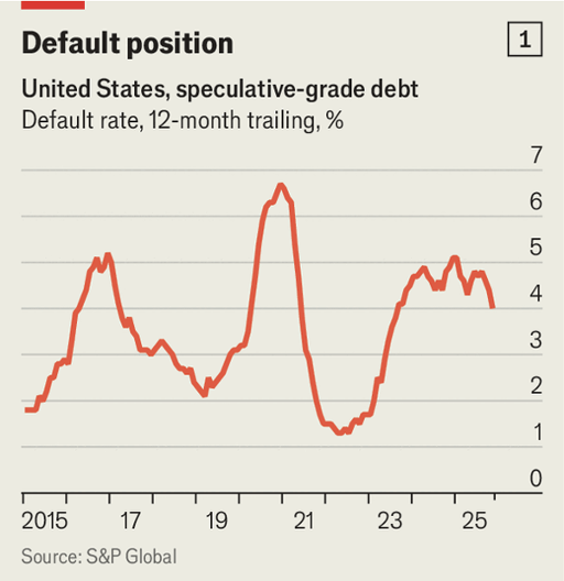 America’s corporate-debt risks had seemed briefly contained, but the latest figures suggest pressure is rebuilding. In 2024 the default rate on speculative-grade debt in America reached 5%, then fell in 2025; over roughly the same period, non-financial corporate debt as a share of GDP dropped from 164% in the first half of 2021 to 141% in the first half of 2025, showing deleveraging under higher rates. Yet the macro cushion is weakening: on March 13th, fourth-quarter 2025 GDP growth was revised down to just 0.7%, below investor expectations.