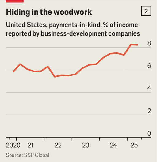 The new fragility is concentrated in private credit and its off-balance-sheet delay mechanisms. Headline default rates on private-credit loans remain below 2%, but once “payment in kind” and other liability-management extensions are counted, the true default rate rises to around 5%. For listed private-credit funds, payment-in-kind arrangements have grown from 5%-6% of income five years ago to 8% now. These manoeuvres can postpone visible bankruptcy, but they also mean standard default indicators understate underlying deterioration.