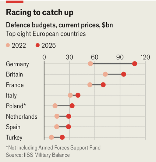 "European governments are increasing defense spending due to pressure from Russia and uncertainties regarding America, launching the €150bn SAFE fund and a National Escape Clause that could unlock €650bn through an additional 1.5% GDP military outlay. By November 30th, 19 countries had subscribed to SAFE, with Poland seeking €43.7bn. NATO's European members aim to raise core defense budgets from 2% to 3.5% of GDP, adding another 1.5% for infrastructure by 2035, as Russia poses an emerging threat by 2027."