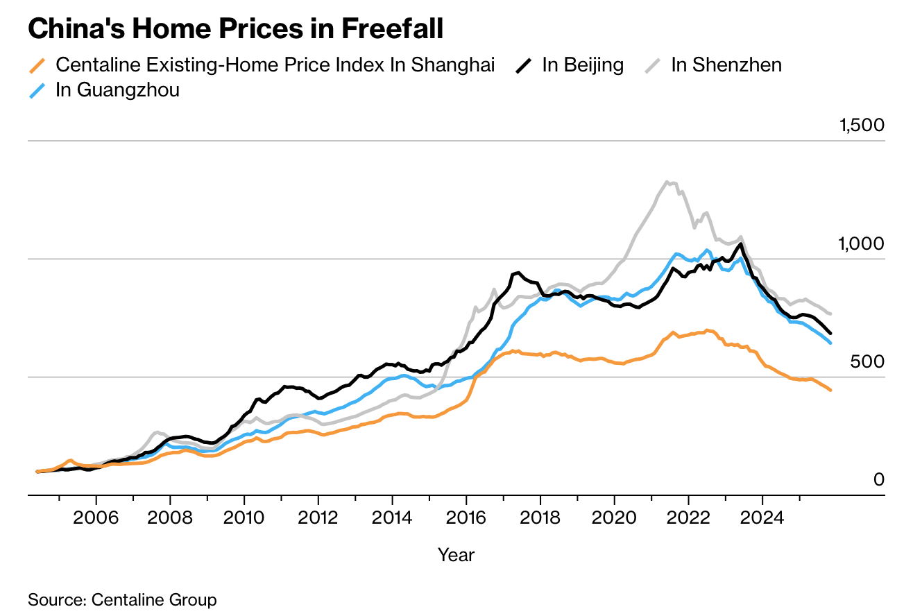 The downturn threatens banks, employment and local government finances. Construction employs 51 million workers, while banks’ bad loans hit a record 3.5 trillion yuan in September 2025. Fitch warns risks may worsen in 2026. Falling home values reinforce deflation, and economists at Morgan Stanley and CF40 argue China’s CPI understates rent declines, meaning the sector’s drag on inflation is significantly undermeasured.