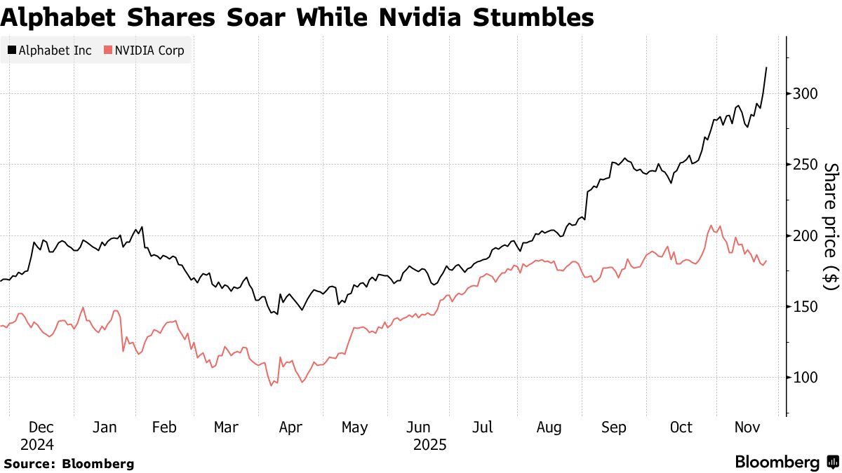 Nvidia shares fell as much as 3% after reports that Meta is in talks to deploy Google’s tensor processing units (TPUs) in its 2027 data centers, signaling growing competitive pressure on Nvidia’s AI accelerators. Alphabet shares rose 2.4%, while Asian suppliers gained sharply, including an 18% jump in South Korea’s IsuPetasys and nearly 5% in Taiwan’s MediaTek. Google’s prior agreement to supply up to 1 million TPUs to Anthropic helped validate TPUs as a credible alternative to Nvidia’s GPUs, prompting broader industry interest.