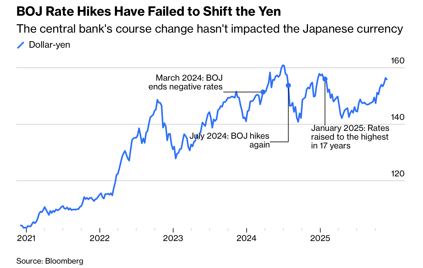 The yen is approaching ¥160 per US dollar, within a foreign exchange market that now trades $9.6 trillion per day, making turning-point predictions extremely unreliable. A major misconception from early 2024—that ending negative rates would inaugurate a yen revival—proved false. A genuine trend reversal would require sustained rate hikes that meaningfully close the Japan–US interest-rate gap, but the BOJ has only raised its policy rate to 0.5% after small increments, and Governor Ueda has turned more cautious following January’s premature hike. Even rate-differential logic is incomplete: South Korea raised rates aggressively, yet the won still weakened. Market narratives dominate fundamentals; for example, Prime Minister Takaichi’s extra budget equals under 3% of GDP, yet traders over-interpreted it as a driver of yen weakness.