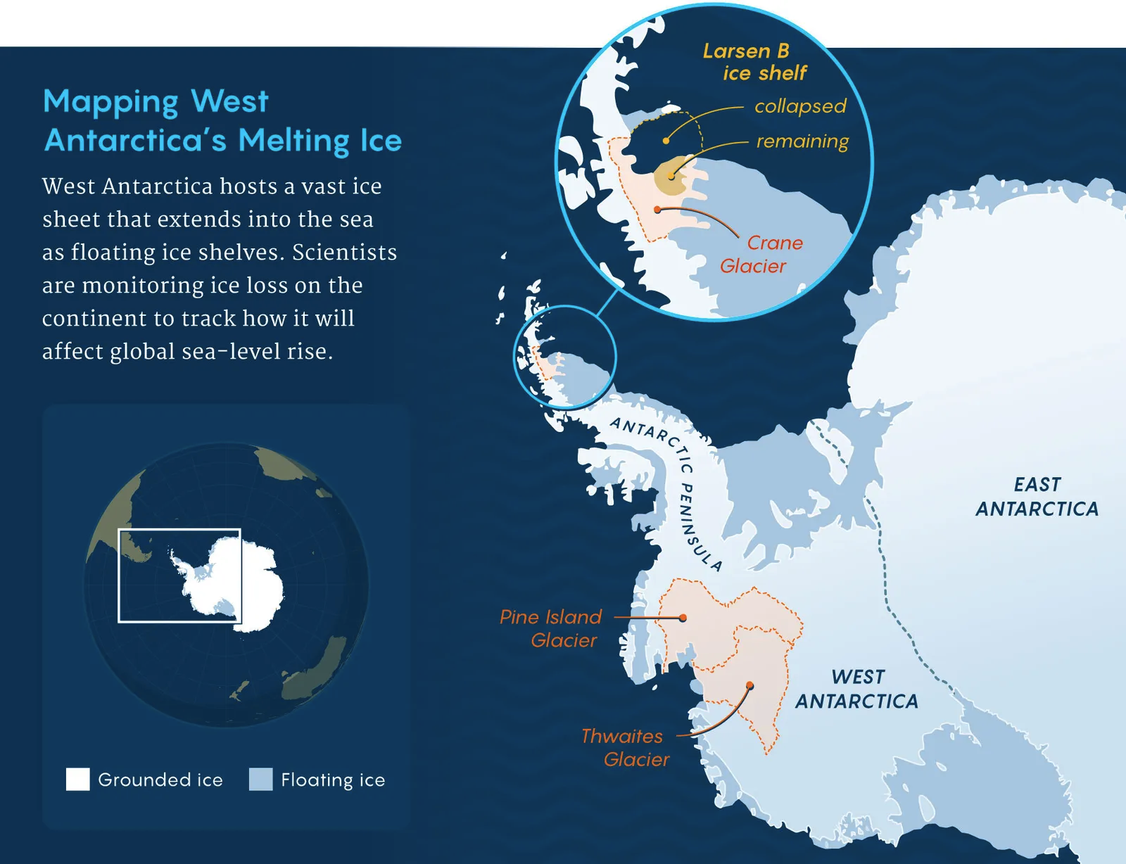 西南极冰盖包含可致全球海平面上升 5 米的储水量,其中外围冰川单独崩解即可在初期触发逾 1 米的上升,威胁约 2.3 亿生活在低于 1 米区域的人口。2014 年观测确认关键冰川已进入不可逆退缩;2016 年的研究提出“海洋冰崖不稳定”(MICI)机制,推算 2100 年前南极可贡献逾 1 米海平面上升;若排放持续,至 2300 年累计可能达 15 米。IPCC 的后续评估给出更保守情形:2100 年全球总上升 0.5–1 米。然而模型差异巨大,尤其集中在冰架崩塌速度与冰崖链式坍塌是否能在数十年内发生。