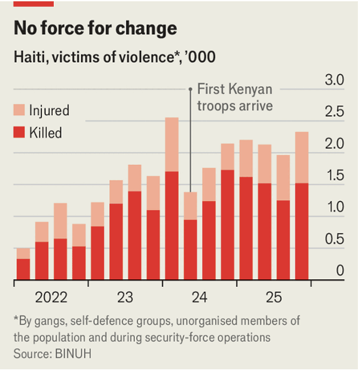 Gang violence in Haiti has escalated since the assassination of President Jovenel Moïse in 2021. A confederation of 26 gangs seized control of much of Port-au-Prince, killing thousands and displacing nearly 1.5m people. Recent police actions suggest some progress. On February 23rd, 2026, the Haitian National Police killed six gang members and seized eight weapons, including four assault rifles, while losing two officers and seeing two others wounded. International support is increasing, with a new Gang Suppression Force planning to deploy 5,500 troops, including an initial contingent of 1,500 expected in April.