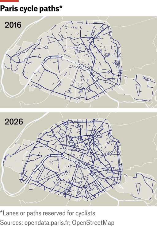 Paris has spent the past decade transforming its transport system by expanding cycling infrastructure. The city now has more than 1,500km of cycle lanes, exceeding the network in Amsterdam. When Socialist mayor Anne Hidalgo took office in 2014 the city already had about 700km of lanes, and the network has since more than doubled. Major streets such as Rue de Rivoli have been redesigned so that two thirds of their width is dedicated to protected bike lanes. As a result air quality has improved, noise has fallen, and more daily trips in Paris are now made by bicycle than by car.