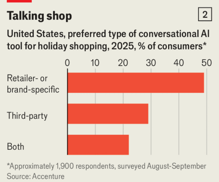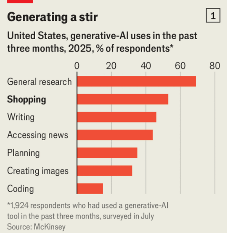AI is increasingly being used as a personal shopper: about two-thirds of consumers in rich countries and five-sixths of 18–24s plan to use it this holiday season, and McKinsey estimates $3–5trn of global shopping could flow through chatbot “agents” by 2030.