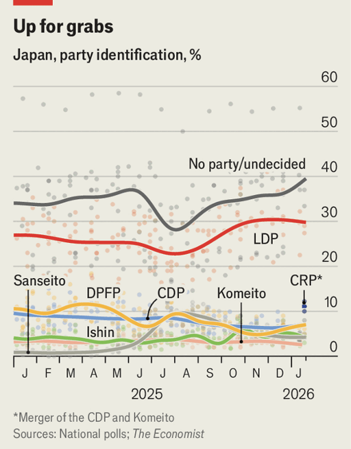 LDP support has edged up to about 35%—ahead of rivals but similar to October 2024, when it lost an outright majority. The opposition is regrouping: the Constitutional Democratic Party and Komeito formed a Centrist Reform Alliance, leveraging Soka Gakkai’s mobilisation in key districts. Populist parties made gains in the past two cycles; though their polls have slipped since Takaichi took office, concerns over immigration and inflation persist. If the LDP regains a majority, her hand strengthens; bond-market turbulence suggests markets see a high chance—but she says she has put her premiership on the line.