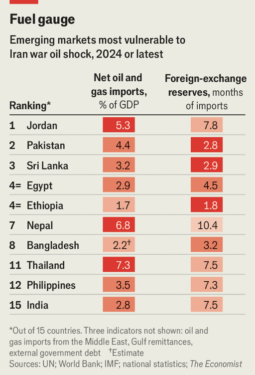 Buffers determine whether stress becomes a balance-of-payments crisis. Pakistan’s reserves cover less than 3 months of imports, below the IMF’s recommended minimum; Egypt faces about $29bn in external debt due this year, more than half its foreign-exchange reserves. Bangladesh and Sri Lanka, though only moderately exposed, are also fragile: Bangladesh’s reserves barely cover 3 months of imports and it is already in an IMF programme; Sri Lanka has only recently emerged from its 2022 default, itself partly triggered by the last energy shock. As capital leaves emerging-market debt funds, higher fuel bills can more easily trigger financing stress.