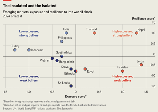 The countries most at risk from the new energy shock are not simply the biggest importers, but those with both high exposure and weak buffers. The article ranks countries on two dimensions: dependence on imported energy and Gulf-linked inflows, and financial capacity to absorb the hit. Jordan, Pakistan and Egypt emerge as the most vulnerable. Pakistan spends about 4% of GDP on oil and gas imports, with nearly 90% sourced from the Middle East; Egypt spends about 3%, with nearly half from the region. Both also rely heavily on Gulf remittances worth around 5% to 6% of GDP, so war can worsen their current accounts from both sides.