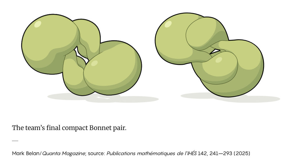 This surface produced a pair of tori sharing the same metric and mean curvature but differing globally, providing a counterexample to the Bonnet problem. The initial pair turned out to be mirror images, which was formally sufficient but unsatisfying. Over the next year, the team relaxed certain constraints and constructed a new version, ultimately generating a pair of highly twisted, visibly distinct tori that still shared identical local data, fully resolving the centuries-old puzzle.