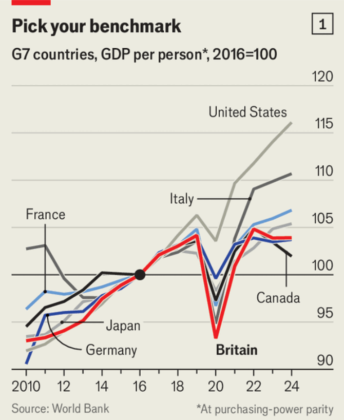 Critics argue the NBER approach fails a “smell test” because it benchmarks Britain against 33 countries and includes the United States, whose post-pandemic outperformance is a difficult comparator; excluding the US, Britain looks fairly average within the G7. UK GDP per person rose 3.9% from 2016 to 2024—below France and Italy but above Germany and Canada—implying unusually strong counterfactual growth would be required if the -6–8% estimate were right.