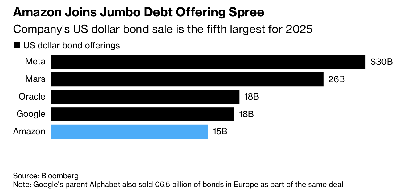 Amazon issued $15 billion of US dollar bonds, exceeding initial expectations by $3 billion and drawing peak demand of roughly $80 billion before order books were cut as pricing tightened. The six-tranche deal included a 40-year note whose spread narrowed from 115 basis points over Treasuries to 85. The sale adds to a series of jumbo tech offerings: Alphabet issued $25 billion this month, Meta $30 billion last month, and Oracle $18 billion in September, pushing global issuance above $6 trillion for the year, with JPMorgan projecting a US high-grade record of $1.81 trillion next year.