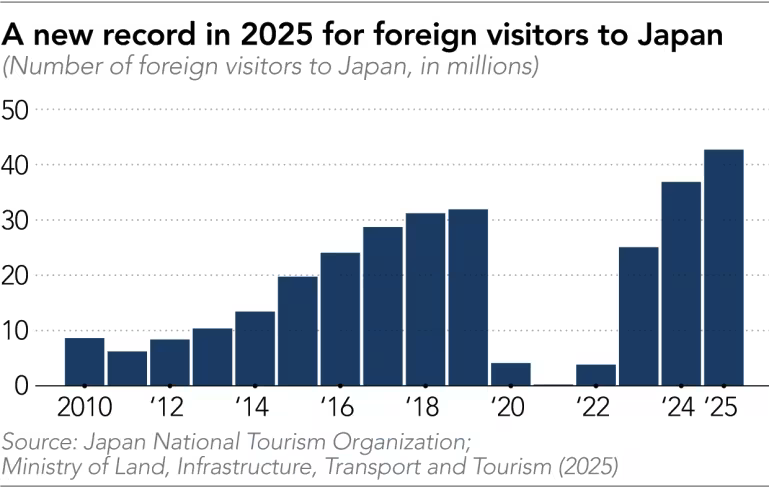 The outlook points to slower growth. Japan aims for 60 million international visitors by 2030, but travel agency JTB forecasts 41.4 million visitors in 2026, marking the first year-on-year decline in five years due to demand normalization and weaker inflows from China and Hong Kong. Officials remain cautious while emphasizing higher-spending tourists and measures to address over-tourism to sustain long-term growth.