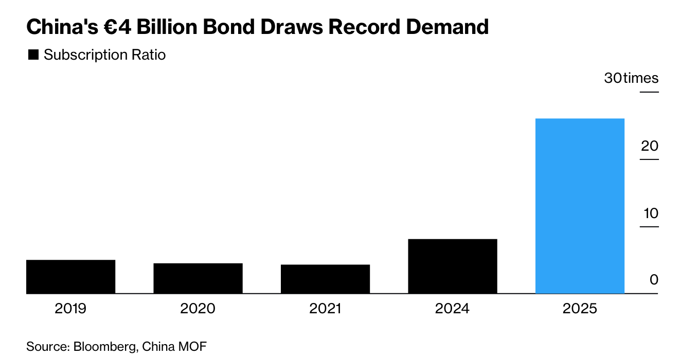 China raised a combined $8.6 billion across dollar and euro markets within two weeks but received at least $234 billion in bids, a record roughly equivalent to a 27× oversubscription. The $4 billion dollar sale on Nov. 5 drew nearly 30× demand, followed by a €4 billion (~$4.6 billion) euro issue that attracted about 25× orders, the highest ever for China’s euro bonds. Robust demand allowed China to price short-maturity dollar notes at levels essentially equal to US Treasuries despite the US having a stronger credit rating; the euro tranches priced at just +5 bps and +13 bps over mid-swap, with risk premiums slightly below China’s outstanding euro curve and only ~20 bps above comparable German sovereign yields.