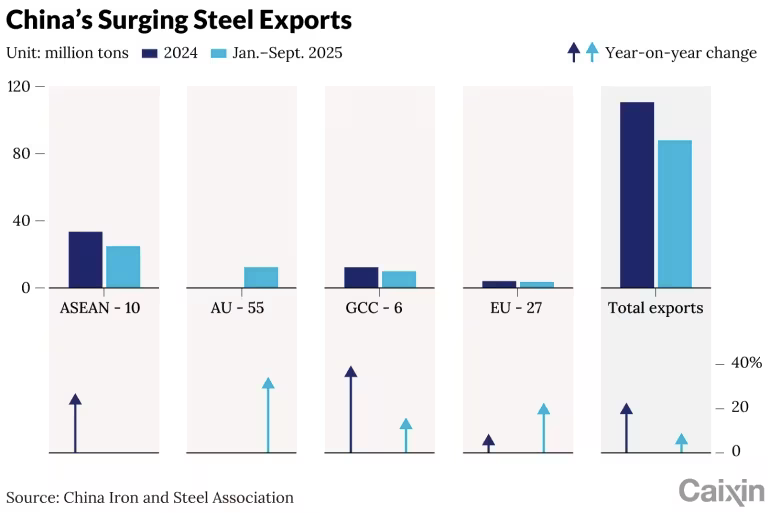 成本端为产量维持提供短期动力。2025 年上半年钢价下跌 7–9%,但炼焦煤指数暴跌 31.5%,低硫主焦煤跌 19.7%,铁矿石跌 7.3% 至每干吨 93.55 美元,使行业前三季度利润达 960 亿元,同比增长近 190%,销售利润率升至 2.1%。但 10 月煤价反弹 10%,利润或再受压。国家要求将粗钢产量从 2023 年水平削减 5%,但“产能置换”导致潜在产能估计达 14 亿吨。上市钢企中仍有 8 家亏损,个别企业库存高达 17 亿至 73 亿元。越南与至少 11 国反倾销措施使部分市场出口量下跌近 30%,但总出口仍因提前采购、新兴市场需求与半成品出口(前三季度 1100 万吨,三倍增)保持高位。