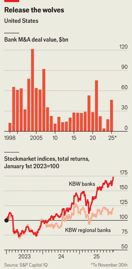 近期交易凸显了银行追求规模和对监管更有把握:Fifth Third与Huntington分别斥资109亿和74亿美元收购小型银行,使各自资产规模突破曾被视为“红线”的2,500亿美元监管门槛,而一笔发生在南部、金额90亿美元的合并在不到五个半月内获批,是自2007–09年金融危机以来同等规模中最快。企业贷款质量可能恶化以及2026年后政治风向转向更严监管仍是潜在风险,但银行家普遍认为,他们至少还有数年相对宽松的窗口可以推动激进的并购。
