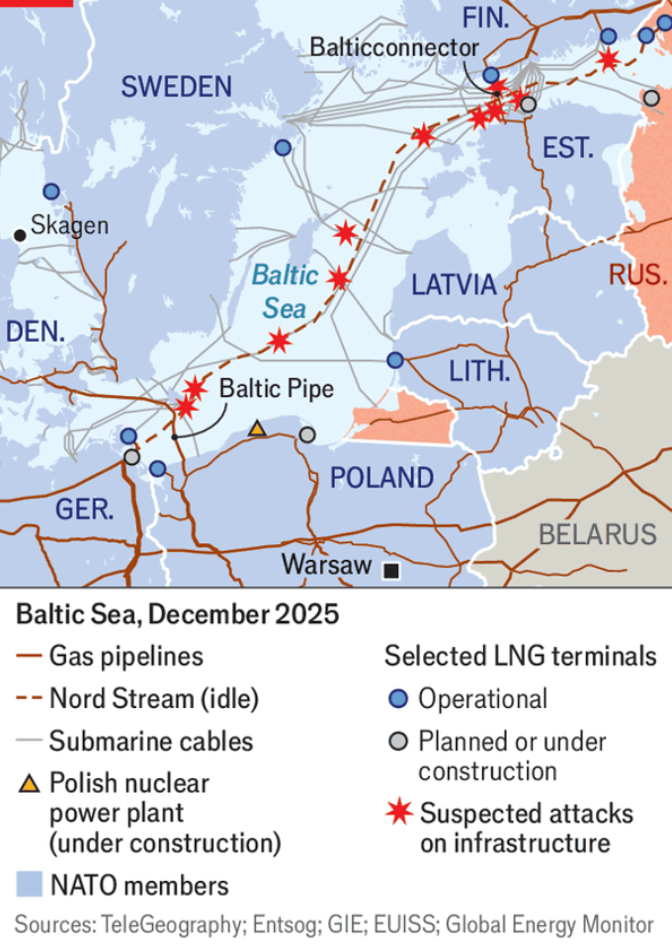 Poland decided on November 26 to buy three Saab-built A26 submarines—66 metres long—for an estimated $2.8bn, seeking “eyes on and under” the Baltic Sea’s crowded seabed. That seabed now carries pipelines and cables alongside 10 LNG terminals (with two more being built) and, after Estonia, Latvia and Lithuania unplugged from Russia’s grid, three of the four links to the European grid run underwater.