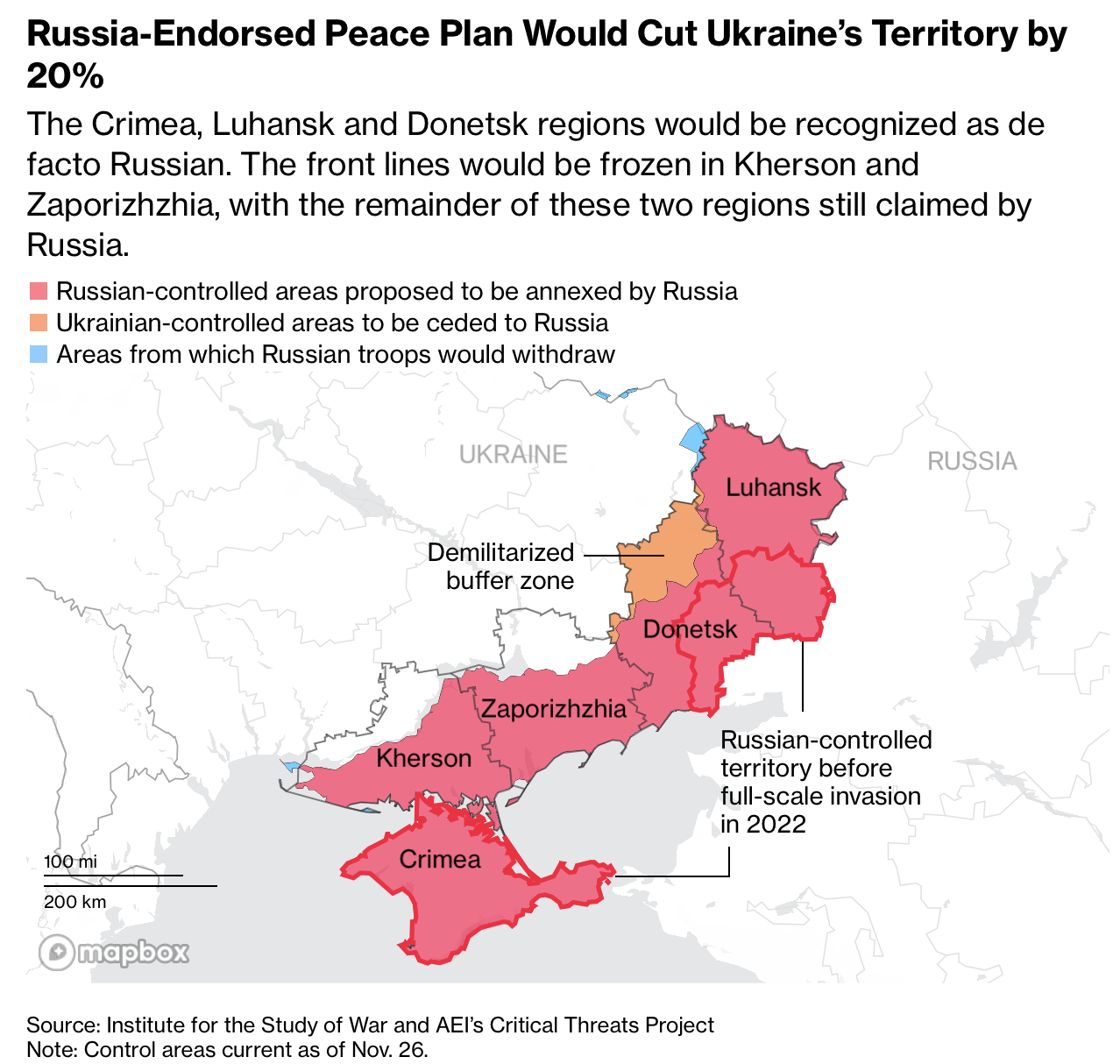 The article argues that territory will be central to any Ukraine peace deal. Russia currently controls nearly one-fifth of Ukraine, including Crimea annexed in 2014 and parts of Donetsk, Luhansk, Kherson, and Zaporizhzhia occupied after the 2022 invasion. In September 2022, Moscow declared four regions annexed and amended its constitution to ban relinquishing claimed land. A 28-point US-Russia proposal in November 2025 called for Ukraine to effectively recognize Crimea, Donetsk, and Luhansk as Russian and freeze control elsewhere along current front lines, prompting strong opposition from Kyiv and European allies.