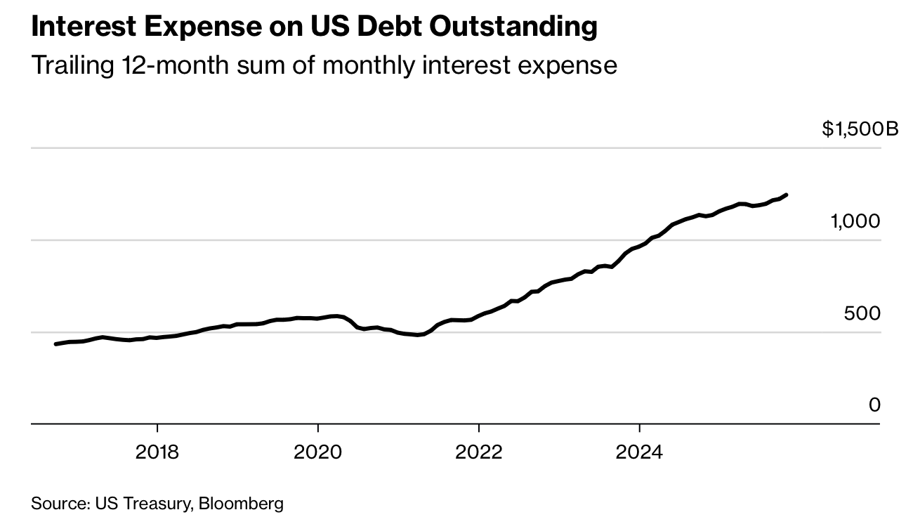 尽管关税收入在 2025 年贡献约 USD 300–400 billion 并帮助压缩赤字规模,其规模仍低于当期利息成本,结构性失衡未获缓解。分析师指出,持续以更高利率再融资旧债提高了长期财政脆弱度,即便债务增速下降,其利息负担在财政比重中持续上升,形成“流沙式”困境。国债拍卖规模在过去两年基本稳定,财政部虽预计未来数季保持不变,但已开始初步讨论提高发行量。