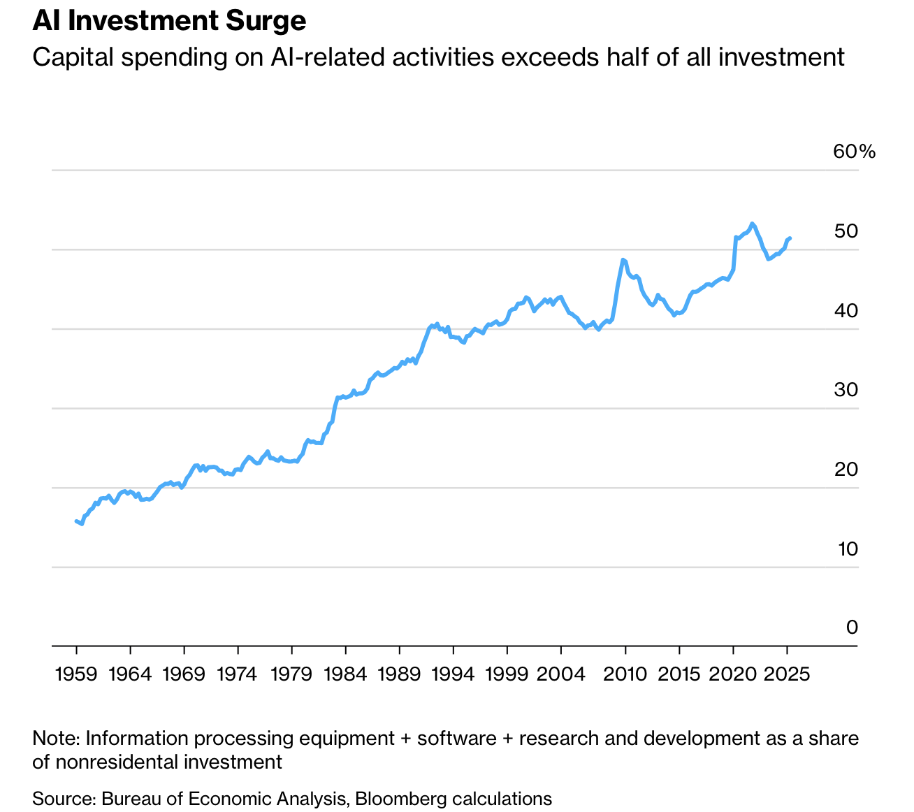 李飞飞回顾 25 年 AI 研究路径,从早期仅 4 到 20 类图像数据集的时代推进到 2009 年前后创建包含 22,000 类与约 1,500 万张标注图像的 ImageNet,实现数量级跃升并重塑视觉智能研究。她将 AI 的影响描述为“文明级别”,强调三年来自 ChatGPT 的扩散与全球投资激增使 AI 触及几乎所有人的工作与生活。她指出 AI 相关资本开支已超过全部非住宅投资的一半,展现结构性规模扩张。