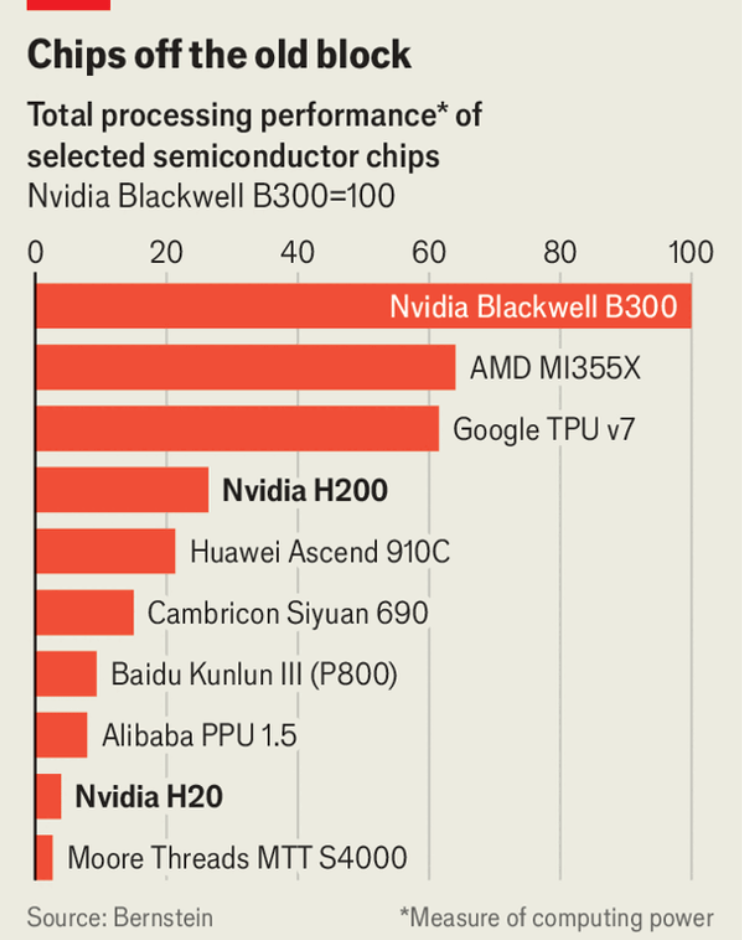 In the race to dominate artificial intelligence (AI), China is neck and neck with America in software, and Chinese models now routinely beat many American ones on popular benchmarks, but a wide hardware gap remains, with America’s chipmakers led by Nvidia far ahead. On December 8, the president authorized sales of Nvidia’s H200 chips to “approved customers” in China in exchange for a 25% cut for the U.S. government, underscoring divided U.S. strategy between cutting China off and keeping it tied to American technology.