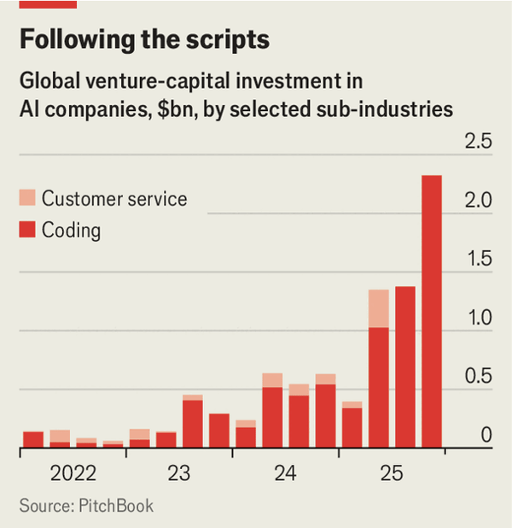 人工智能的采用在计算机编程和客户服务领域最为深入:约三分之二的程序员每周都会使用AI工具,GitHub Copilot拥有2,600万用户,而Anthropic聊天机器人约三分之一的查询与编程相关。客户服务方面,85%的经理计划在今年试验AI,自从2022年ChatGPT推出以来,客户服务外包商Teleperformance的股价已下跌约四分之三,显示投资者对即将到来的颠覆抱有强烈预期。