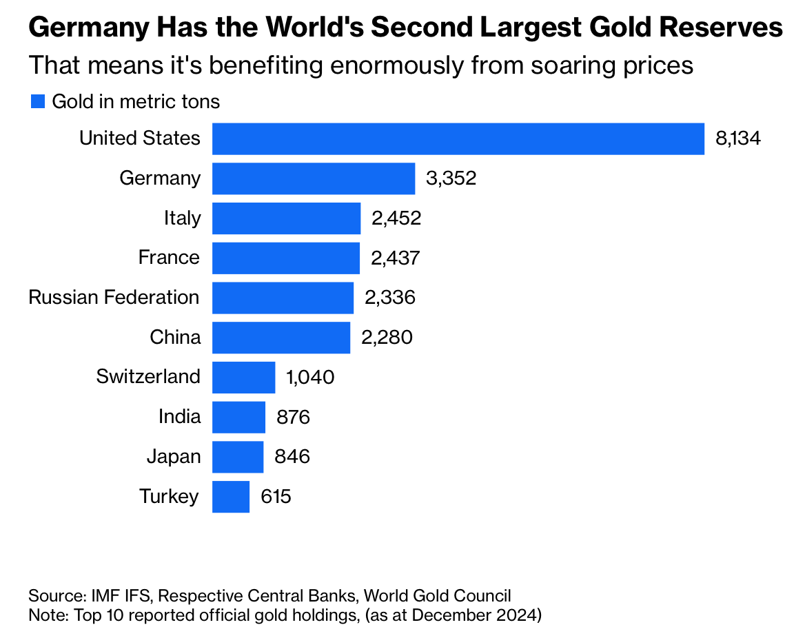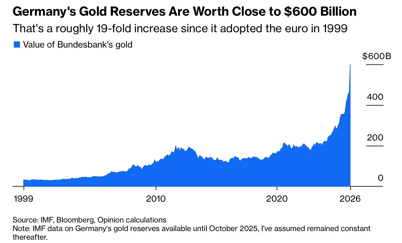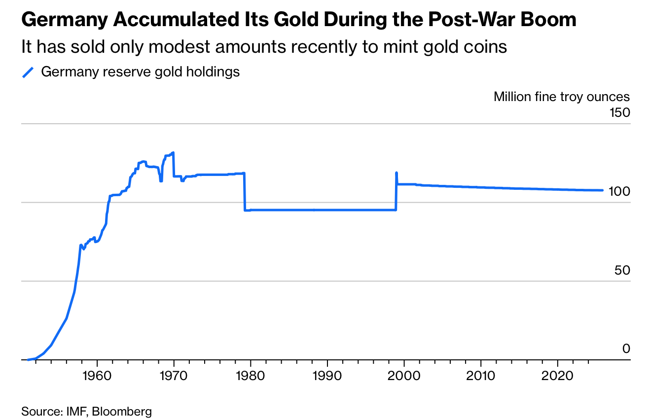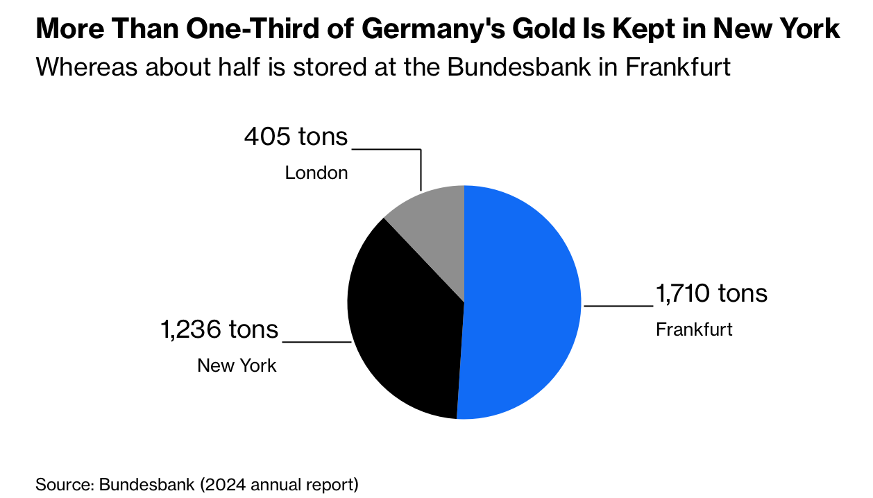 Germany’s central bank holds about €500 billion ($599 billion) in gold, the world’s second-largest official stockpile after the US, equal to roughly 18% of national debt and nearly a 19-fold increase in value since adopting the euro in 1999. About 1,236 tons—nearly 100,000 bars—are stored at the New York Fed, worth around $220 billion. Soaring prices have inflated the balance sheet, but the hoard earns no interest and concentrates risk in a single volatile asset.