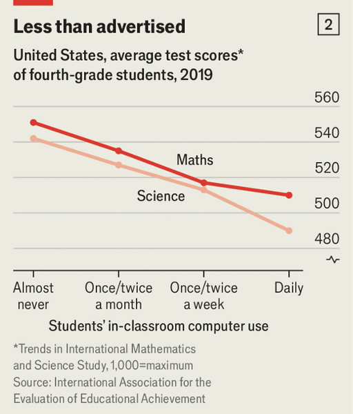 Long-run trends are troubling. Scores on 21 national benchmarks rose from 1994 to a 2012–15 peak, then fell as in-class screen use soared. Major assessments from 2011–19 show more computer use correlates with lower maths, science and reading scores; classes with little or no computer use score highest. Distraction, gamification and weakened classroom relationships are likely factors. Evidence supports only limited uses—such as drills for certain learning disabilities or narrow domains like arithmetic. After a decade and hundreds of billions spent, the verdict is clearer: ed tech yields modest returns; investing in teachers may deliver more.