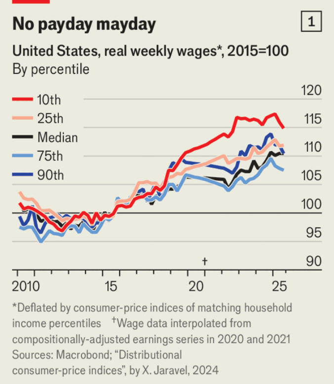 特朗普在2024年获胜时把通胀归咎于民主党并承诺价格会很快下降,但关税抬高了进口成本,而宏观图景更为平稳:实际工资已连续十年上升,且接近历史高位,低收入者尤为明显。美联储偏好的PCE通胀同比为2.8%,目标为2%(超出0.8个百分点),并在两年内大致处于2–3%区间,但价格水平仍比疫情前高约25%,即使名义工资也已上升约30%。