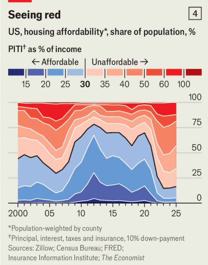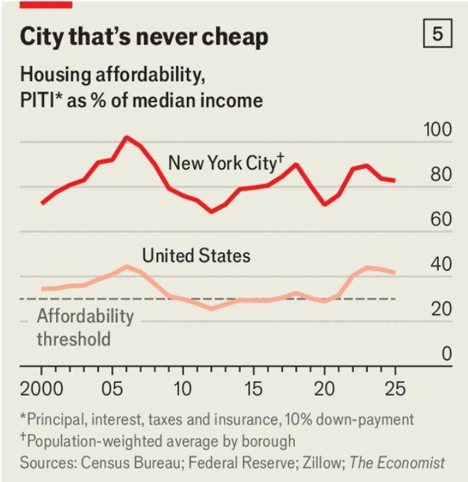 尽管鸡蛋价格曾上涨到四倍,食品杂货总体仍大体跟随总体通胀;自2019年以来电价相对通胀高出超过10个百分点;而汽油价格自2019年以来已下降,尽管家庭在汽油上的支出约比电力高40%。住房是最明显的挤压:在曼哈顿和布鲁克林,按揭、保险和房产税超过当地平均税前收入的90%,而可负担性的经验规则是30%;在超级城市之外,自2022年以来按揭利率上升使多数县超过这条30%线(即便首付10%),不过存量按揭平均利率约为4.3%,比新按揭低近2个百分点。