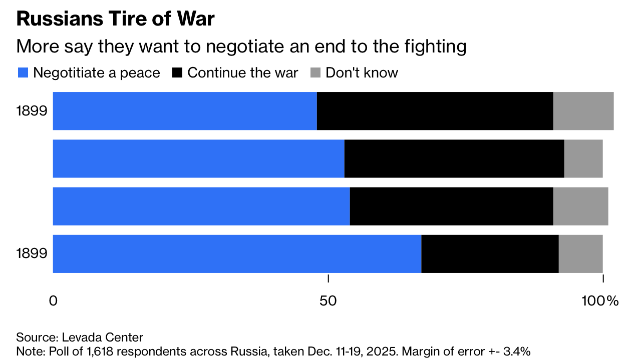 国内数据为普京的沉默提供解释。2023年的实地观察显示,俄罗斯社会中对西方的敌意与对斯大林的崇拜上升,但到2025年底,经济压力、通胀和阵亡人数增加削弱了战争热情。列瓦达中心在2025年12月11日至19日对1,618人调查发现,67%的受访者支持通过谈判结束战争,仅25%希望继续作战,这是入侵以来的最低值。尽管这不等同于反对普京,却明显限制了其公开升级战争叙事的政治空间。