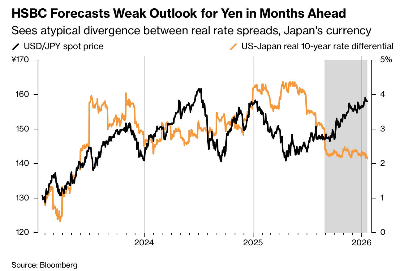 HSBC identifies two main catalysts: Japan’s inflation pickup since 2022 and Prime Minister Sanae Takaichi’s rise to power in October alongside expansionary fiscal plans. Her proposed initial budget totals about ¥122.3 trillion, roughly $775 billion. Strategists now expect the yen to weaken to 160 per dollar by midyear, reversing a prior forecast of 150, while noting potential intervention risks below 160. Without a US economic slowdown, falling US real yields, or credible fiscal consolidation and policy credibility in Japan, the yen’s elevated risk premium is unlikely to fade soon.