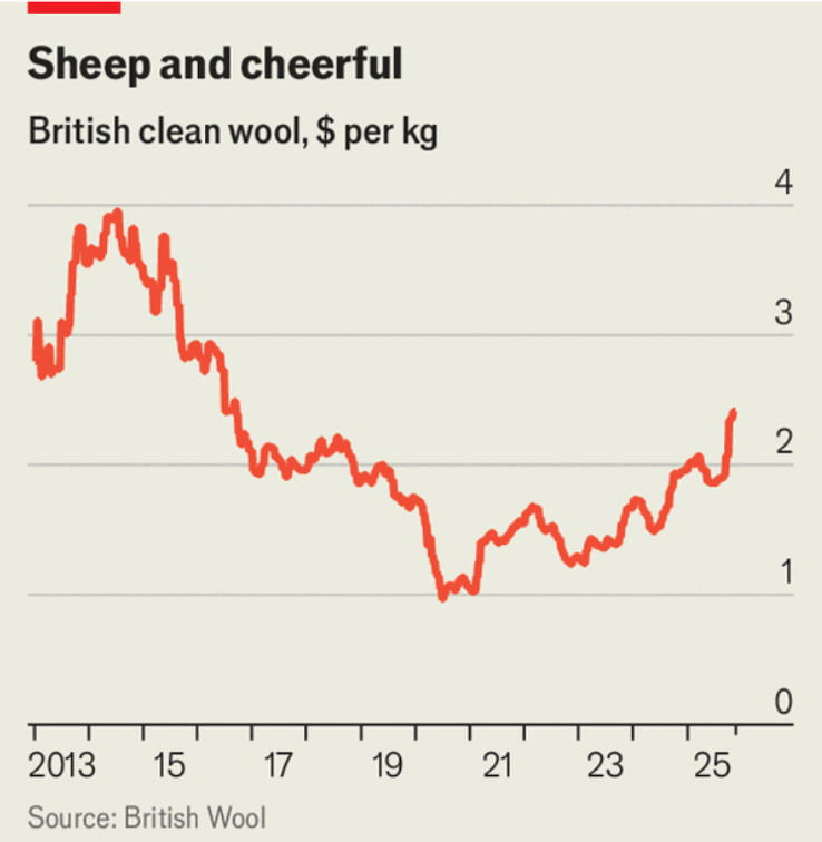 British wool prices have risen over the past year. At the twice‑monthly Bradford auction on December 2, the average price of clean wool hit a near‑decade high of £1.82 ($2.43) per kilogram, up 26% since September and last seen around 2016; yet the long trend remains sharply down, from £17.50 per kilogram in 1952 (in today’s prices) to just 73p in 2022.