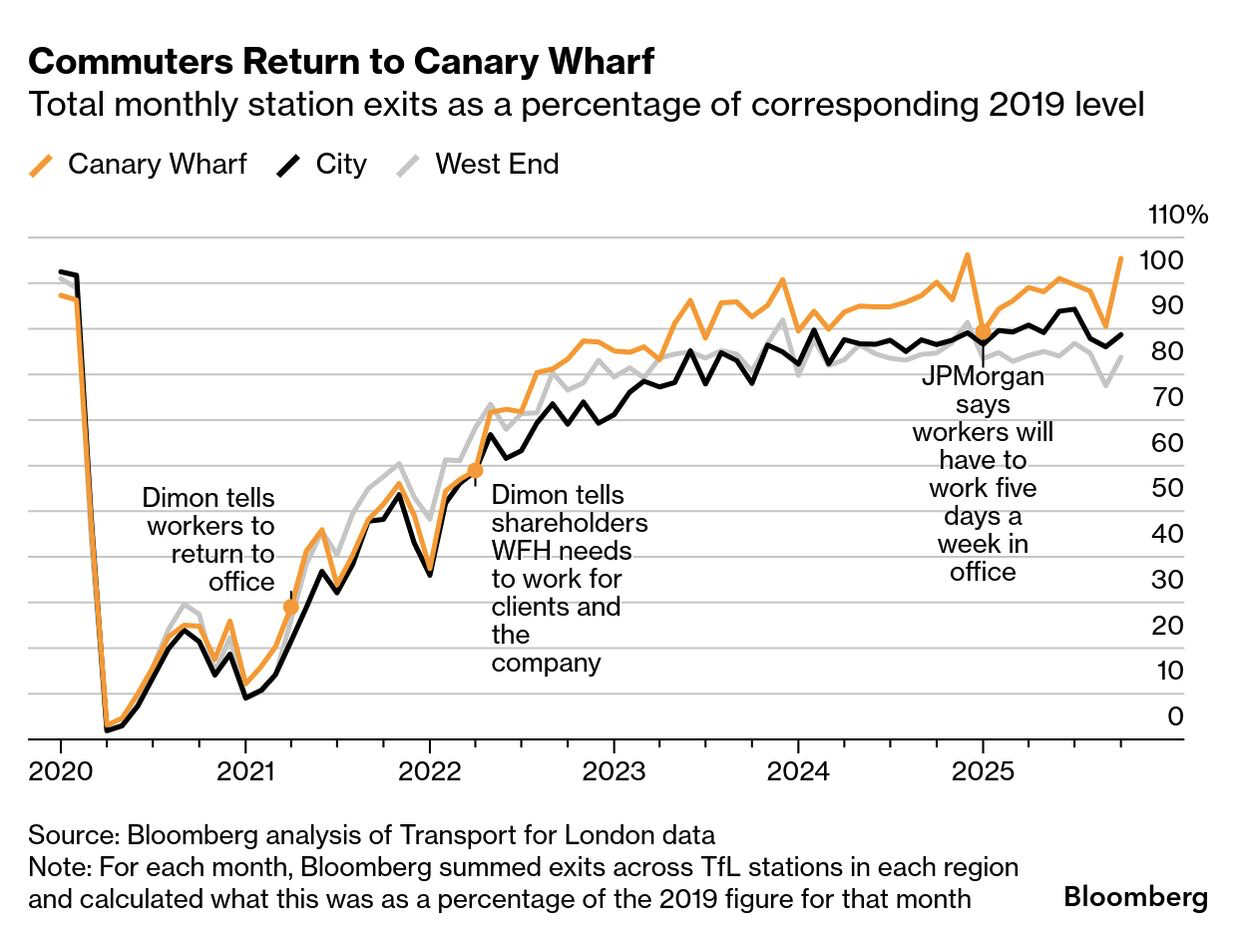 十月平均每日前往Canary Wharf的地铁和铁路行程约为91,000次,达到2019年同期的105%,而West End与City仅恢复至84%与89%。JPMorgan推行每周五天返岗政策并租下额外楼层加速人流回升。Canary Wharf Group在2024年吸引访客7,200万次,2025年同比再增长约6%,并运营超过320家商店与80家餐饮点。Elizabeth Line于2022年开通后提升跨城速度,但高利率与远程办公冲击导致其资产2023年价值下跌14.7%,并触发Moody’s将债务进一步降至垃圾级。