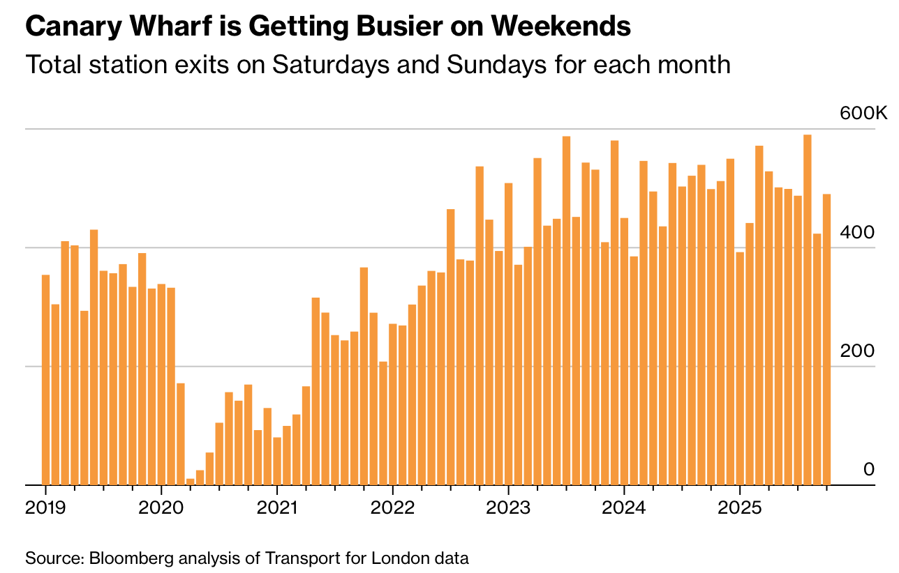 空置率在2025年第三季降至11.4%,较一年前的13.6%明显改善,并接近长期均值。租金展望转向上行,因高等级办公空间需求旺盛而供应有限。再加上美国企业带动返岗与周末休闲访客增长,Canary Wharf在疫情后形成数据上可量化的反转迹象。